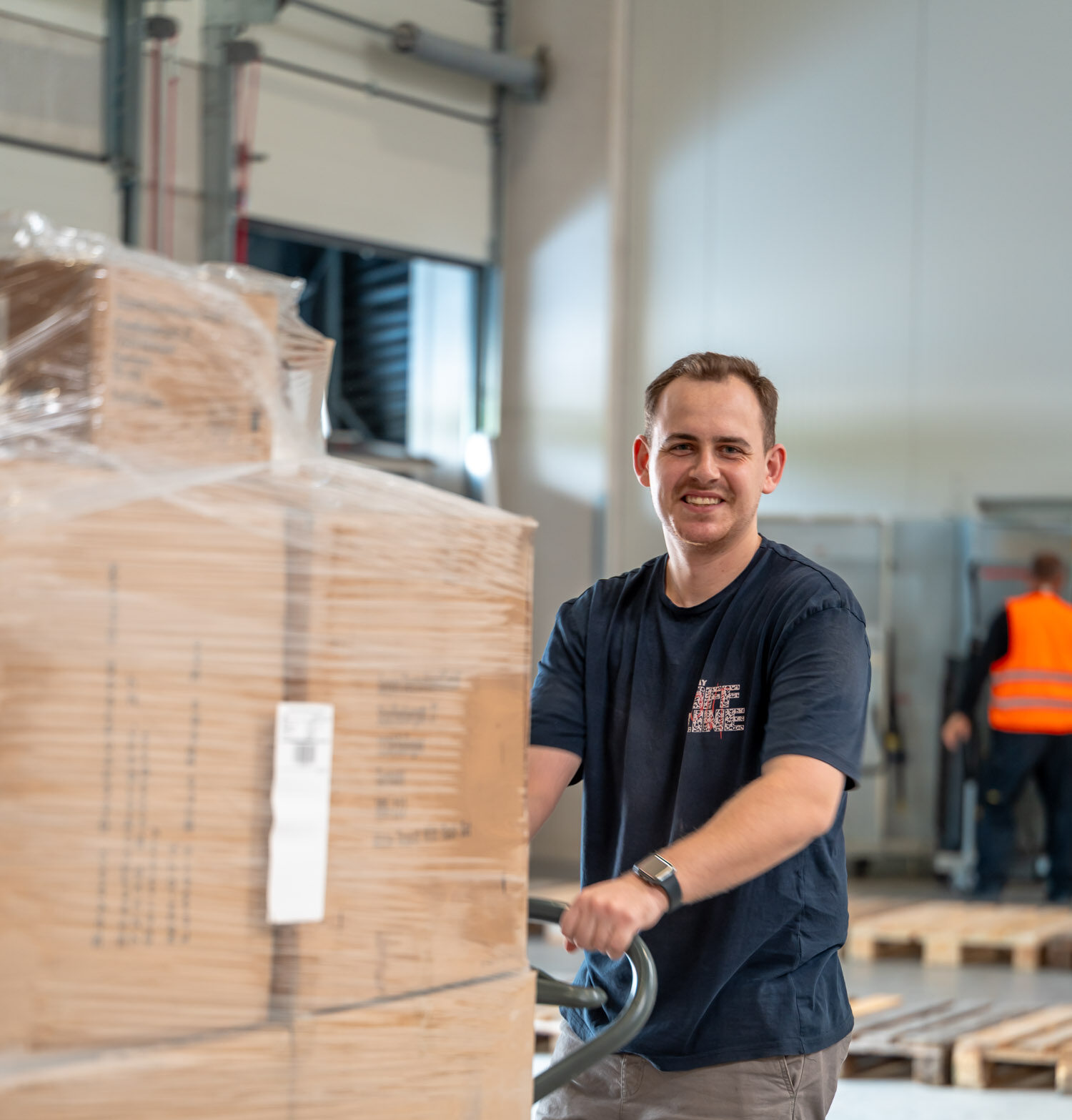 Norbert verantwortet alle Lageraktivitäten – Wareneingang, Qualitätskontrollen, Etikettierung, Palettierung und Versand.